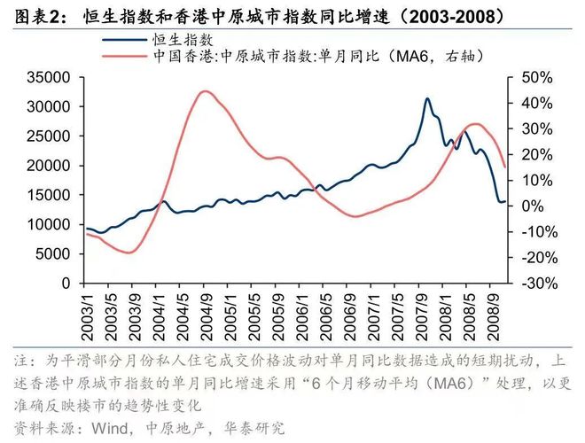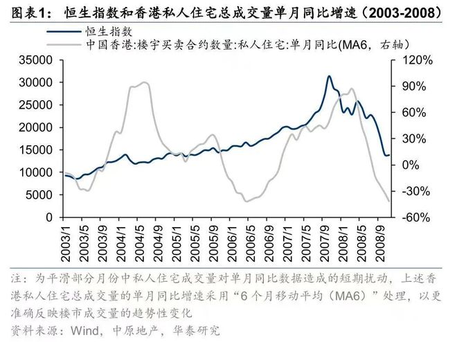 如2003年SARS后的经济复苏阶段,恒生指数从2003年3月的8634点涨至2007年10月的31353点,涨幅达263%,而私人住宅成交量同比增速在7个月后转正,楼价同比增速则在11个月后回升。