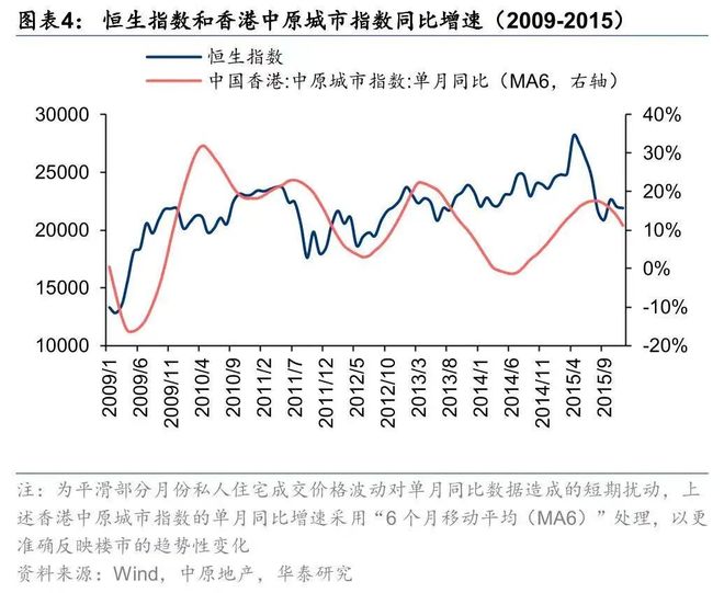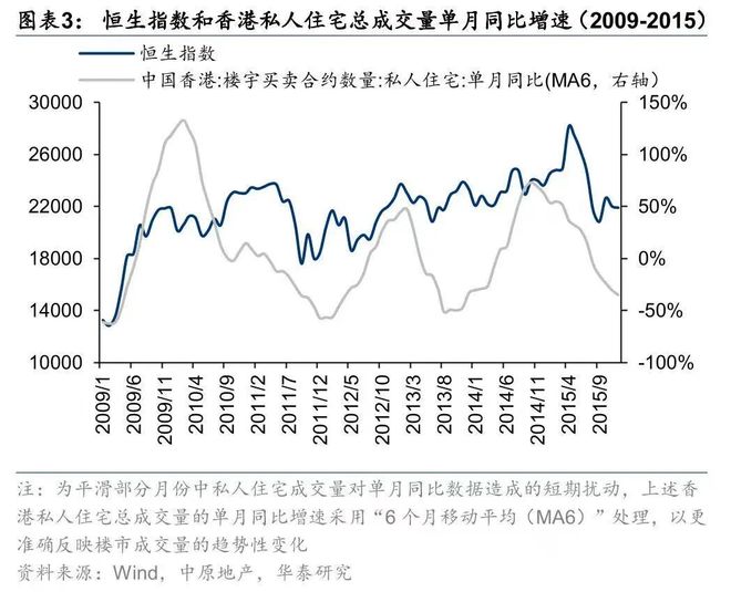 基于几轮周期的指数趋势对比,华泰研究认为,香港股市与楼市在趋势上存在联动关系,恒生指数的上涨往往领先于楼市成交量和价格的修复。