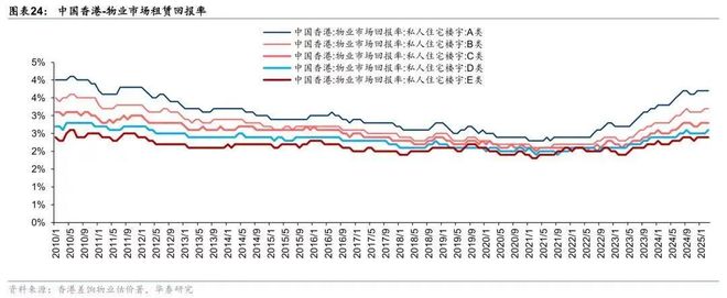 据华泰证券统计,此前香港住宅租金回报率进入上升通道。截至2025年3月,A类(小型单位)至E类(大型豪宅)单位的租金回报率分别为3.7%、3.2%、2.8%、2.6%和2.4%。而当时部分银行按揭利率一度低至2%。