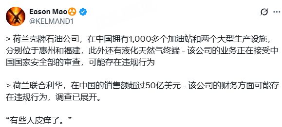 网传消息透露:荷兰壳牌石油公司,在中国拥有1,000多个加油站和两个大型生产设施,分别位于惠州和福建,此外还有液化天然气终端 - 该公司的业务正在接受中国国家安全部的审查,可能存在违规行为。