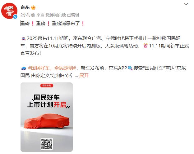 红星资本局10月14日消息 今日,京东官方微博宣布,京东联合广汽(广汽集团;601238.SH)、宁德时代(300750.SZ)将正式推出一款汽车,官方将在10月底陆续开启内测版、大众版试驾活动,11月9日新车正式官宣发布。