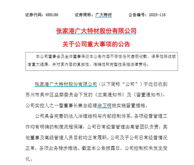 红星资本局10月14日消息,广大特材(688186.SH)10月14日晚公告,公司于近日收到苏州市吴中区监察委员会下发的《立案通知书》及《留置通知书》,公司实控人之一暨董事长兼总经理徐卫明被实施留置措施。