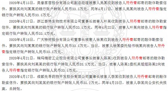 据中国裁判文书网2021年2月披露的《符丹青敲诈勒索罪一审刑事判决书》显示,2020年3—4月中旬期间,1989年出生、高中学历的被告人符丹青冒充记者身份,将200多封敲诈勒索信件寄出。在勒索信中,符丹青声称掌握了上市公司高管们的“私人秘密”,要求收件人向他持有的银行账户转账33.5万元或35.2万元。