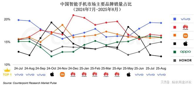 在这场突围战中,华为、小米、vivo通过科技创新引领中国智能手机市场。根据Counterpoint Research Market Pulse数据,2024年7月至2025年8月,华为、vivo和小米位列中国智能手机市场销量前三,占比分别为17.6%、17.6%、16.4%,合计市场份额过半。