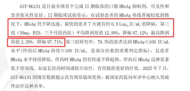 2025年7月,GST-HG131因现有数据提示具有明显临床优势,被国家药监局审评中心纳入突破性治疗品种名单。