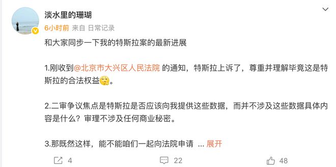 此外,张女士在其微博中提到:“二审争议焦点是特斯拉是否应该向我提供这些数据,而并不涉及这些数据具体内容是什么?审理不涉及任何商业秘密。那既然这样,能不能咱们一起向法院申请公开庭审?”