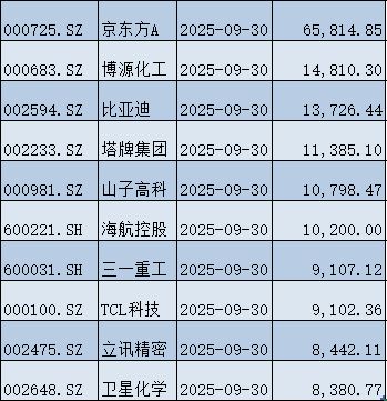 三一重工(600031)、TCL科技(000100)、立讯精密(002475)、卫星化学(002648)等,三季度分别增持了9107.12万股、9102.36万股、8442.11万股、8380.77万股。