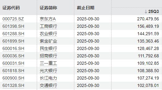 紫金矿业(601899)、三一重工(600031)、长江电力(600900)等股票,持股数量位居前十,分别为13.54亿股、10.91亿股、10.73亿股。