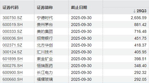 招商银行(600036)、北方华创(002371)、汇川技术(300124)的持股市值超过400亿元,分别达到451.75亿元、418.37亿元、405.95亿元。