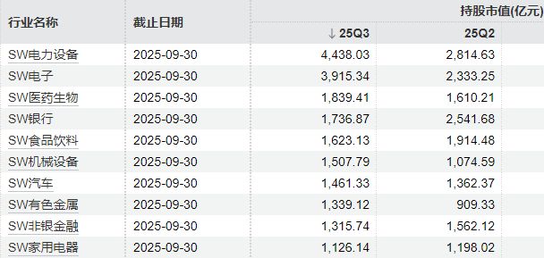 行业方面,申万一级行业分类下,今年三季度,北向资金对银行、电子、非银金融、电力设备、有色金属的持股数量最大。其中,电子的持股数量增加最多,达到18.21亿股。基础化工、汽车、农林牧渔、建筑材料、环保、机械设备等行业,北向资金的持股增加数量均过亿。