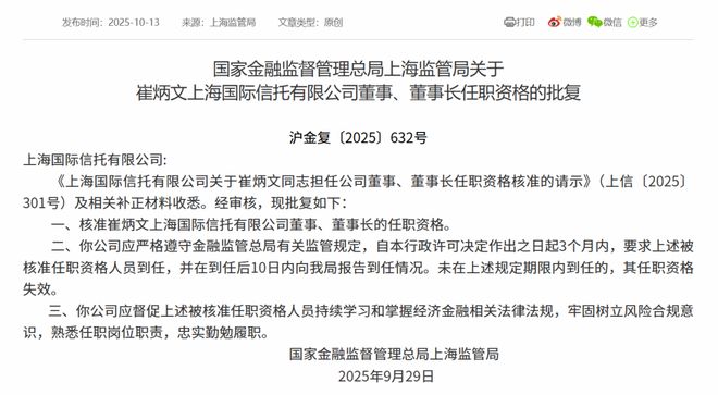 10月13日,国家金融监督管理总局上海监管局公布相关批复,核准崔炳文上海国际信托有限公司(下称“上海信托”)董事、董事长的任职资格。