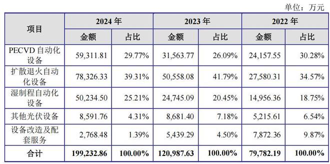 江松科技主要从事高效光伏电池智能自动化设备的研发、生产与销售,是国内光伏电池智能自动化设备领域的龙头厂商。公司主要产品包括光伏电池扩散退火、PECVD、湿法制程等工序的智能自动化设备和其他光伏设备,能够为客户提供智能、高效的全流程智能装备整体解决方案。受光伏生产厂商需求不断变化及光伏电池片生产技术更新迭代较快的影响,下游光伏生产厂商对自动化设备的技术要求不断提高。