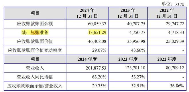 2022年末-2024年末,江松科技坏账准备金额分别为4718.33万元、4750.77万元和1.365亿元。2024年,公司信用减值损失金额较大,主要系应收账款计提的坏账准备增加所致。一方面,公司生产规模扩大,营业收入大幅增加,造成应收账款金额增加,相应的按账龄计提的信用减值损失增加;另一方面,随着2024年光伏行业阶段性供需失衡,竞争加剧,部分客户经营存在困难,导致公司应收其款项存在无法收回的风险,故公司对部分客户的应收账款进行了单项计提,信用减值损失有所增加。