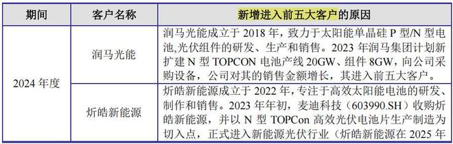 2023年,公司新增前五大客户分别为通威股份、正泰集团、中润光能和钧达股份,2024年公司新增炘皓新能源和润马光能。