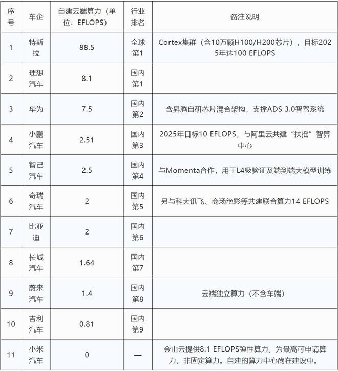公开数据显示,截至今年8月,全球车企云算力排行中,除特斯拉以大约100 EFLOPS的云算力遥遥领先,其余理想(8.1EFLOPS)、小鹏(10EFLOPS)、小米(11.4EFLOPS)等头部智驾品牌的算力基本都要低一个数量级,至于再低两个数量级的哪吒等品牌,其云算力几乎不足以支撑VLA的高效训练。