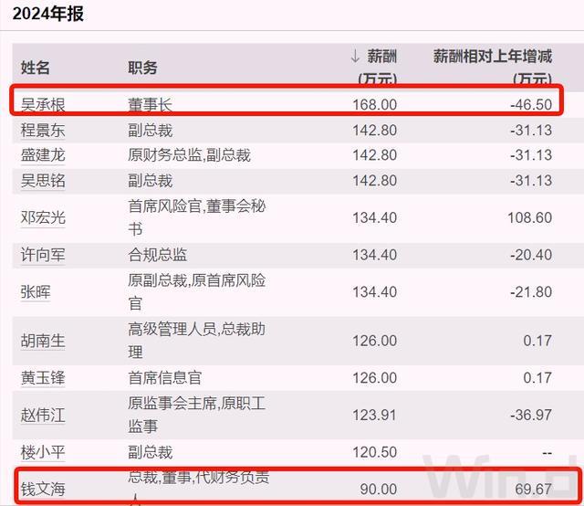 根据公司年报,2024年,吴承根的税前薪酬为168万元,减少46.5万元,依旧排在第一位;钱文海薪酬刚好90万元,在高管中非常靠后。