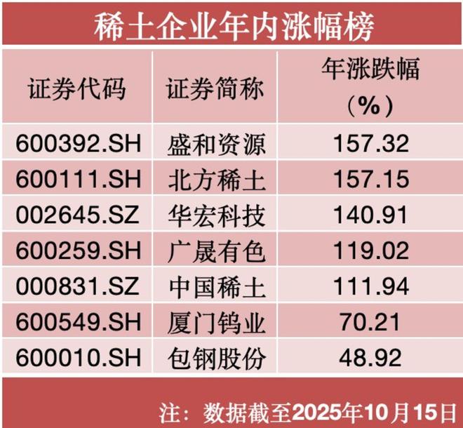 消息一出,已经大涨的稀土板块再次强势向上,10月9日板块大涨7.97%后10月13日再录得9.49%的单日涨幅,个股更是掀起飙涨潮。截至10月15日收盘,北方稀土(600111.SH)、华宏科技(002645.SZ)、广晟有色(600259.SH)等5只年内涨幅都已经超过110%,涨幅最小的包钢股份(600010.SH)涨幅也有48.92%。