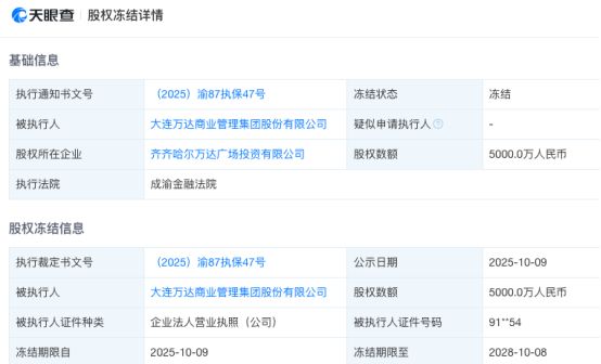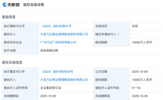 红星资本局10月15日消息,据天眼查披露信息显示,10月9日,大连万达商业管理集团股份有限公司(以下简称“大连万达商管集团”)新增两则股权冻结信息,股权所在企业分别为广州万达广场投资有限公司、齐齐哈尔万达广场投资有限公司,冻结股权数额分别为1亿元、5000万元,合计1.5亿元,冻结期限自2025年10月9日至2028年10月8日,执行法院均为成渝金融法院。
