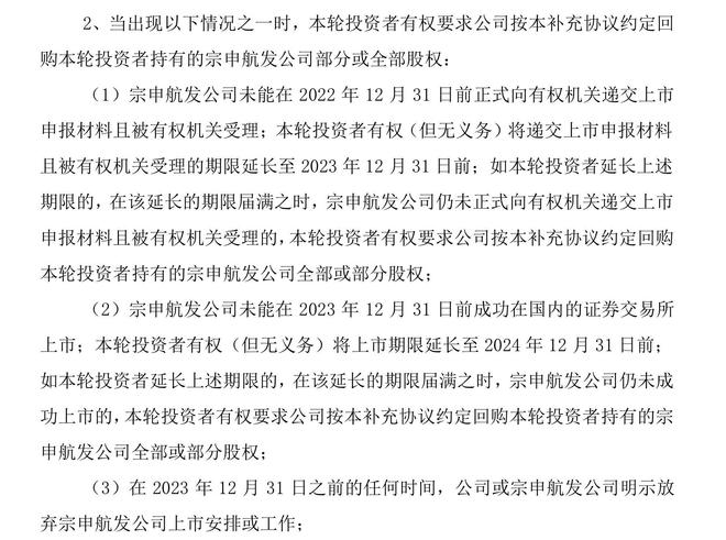 当时的增资协议补充协议要求,宗申航发公司暂停或放弃首次公开发行或撤回首次公开发行的申请、申请上市未被批准、收到核准后12个月内未实现上市、2022年底前未提交上市申报(可延长至2023年底)、2023年底前未能实现上市(可延长至2024年底)等条件下,战略投资者都可要求宗申动力回购股份,并还要按照8%年化收益率进行利息计算。