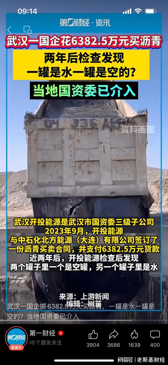 2023年9月,武汉开投能源花6382.5万买了1.5万吨沥青,今年8月开箱一看,两个本来应该装沥青的油罐——