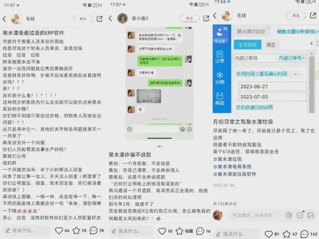 消费者投诉平台“黑猫投诉”显示,关于“聚水潭”的投诉达到433条,内容包括虚假宣传、不退款、试用版和实际使用版不同、售后服务差等。