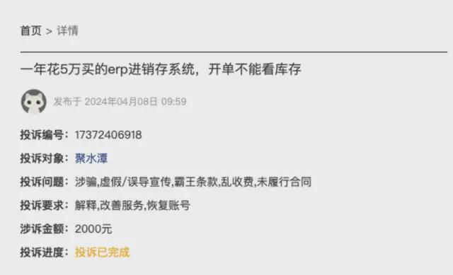 一位用户表示,公司2022年购买聚水潭软件使用,后期一直升级,到2023年8月后,公司软件各项续费一年达5万元,但系统里面聚货通开单,居然不能看库存,还得缴费升级才行。
