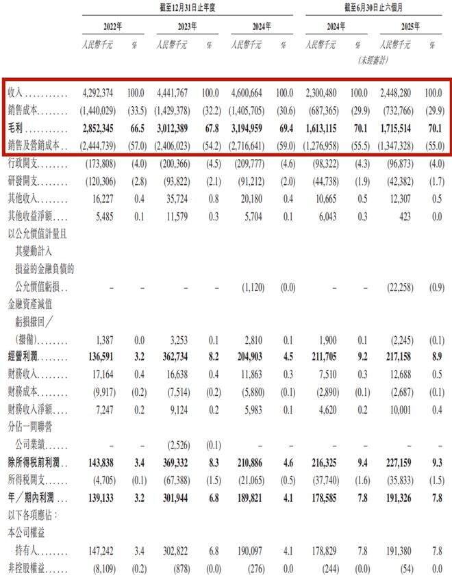 同期,净利润分别为1.39亿元、3.02亿元、1.90亿元和1.91亿元;毛利率也逐年上升,从2022年的66.5%升至2025年上半年的70.1%。