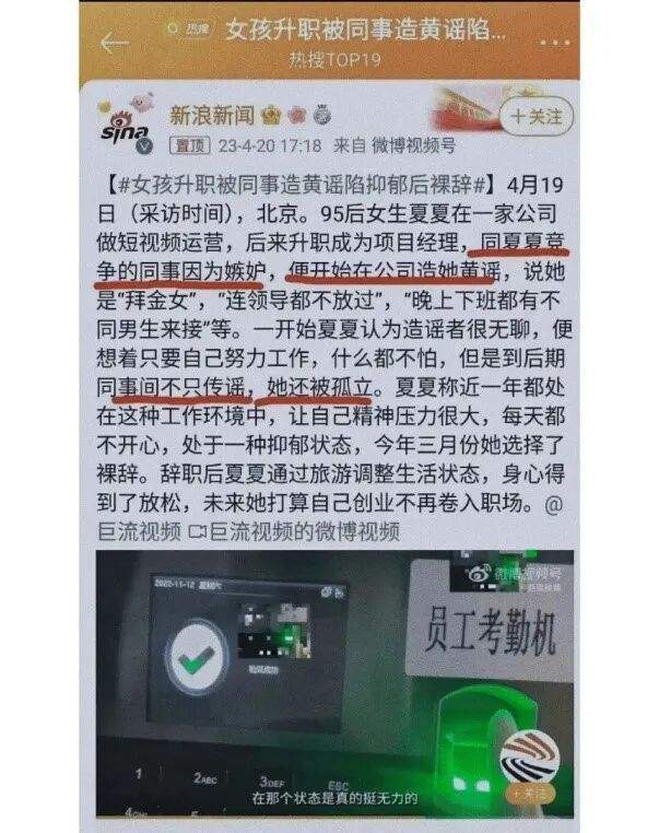 同事因为嫉妒,开始在办公室散布谣言:“拜金女”连领导都不放过”“晚上上下班都有不同男生来接她”。逼得夏夏陷入抑郁,最后裸辞。