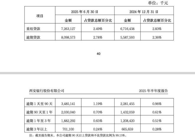 截至2025年上半年,西安银行逾期贷款金额达80.99亿元,较2024年末增长44.94%,其中逾期1-90天的短期贷款金额从22.81亿元增至34.85亿元,占比从0.96%升至1.19%,增幅最大。