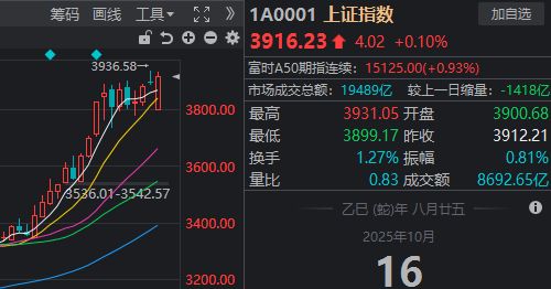 10月16日,市场冲高回落,三大指数盘中一度集体翻绿。截至收盘,沪指涨0.1%,深成指跌0.25%,创业板指涨0.38%。