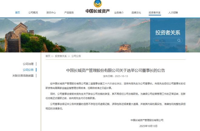 10月13日,长城资产官网发布公告称,经第二届董事会第三十六次会议决议,选举向党为公司董事长。其任职资格尚需金融监管总局批准。