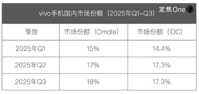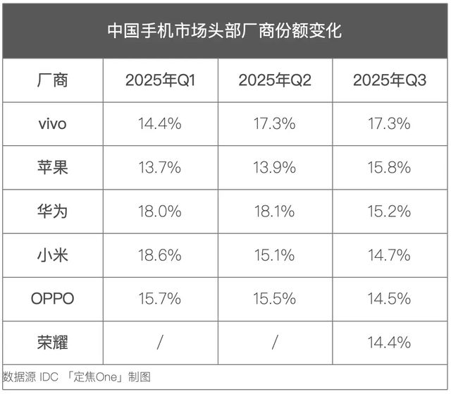 这次轮到vivo。根据Omdia和IDC的数据,vivo以18%左右的市场份额重返榜首。华为与苹果则在15-16%的区间内争夺第二、三名。