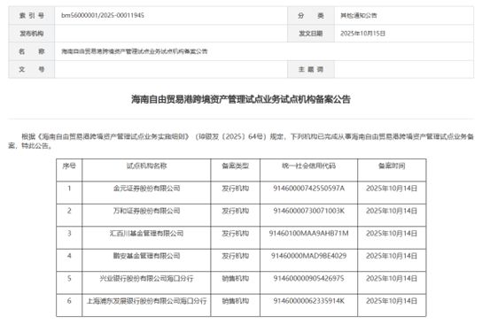 10月15日,海南证监局备案信息显示,金元证券、万和证券、汇百川基金和鹏安基金作为发行机构备案,将负责设计和管理面向境外投资者的跨境资管产品。而兴业银行海口分行和浦发银行海口分行作为销售机构备案,承担产品的销售与服务工作。
