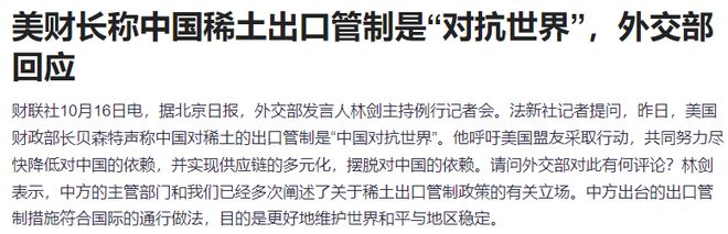 昨晚美国财政部长贝森特声称中国对稀土的出口管制是“中国对抗世界”。他呼吁美国盟友采取行动,共同努力尽快降低对中国的依赖,并实现供应链的多元化,摆脱对中国的依赖。对此,外交部做出回应。