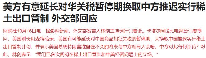 美国财长贝森特暗示,美国有可能延长对中国商品加征关税的暂停期,来换取中国推迟实行稀土出口管制计划,并表示美国总统特朗普准备在不久的将来与中方领导人会晤。对此,外交部做出回应。