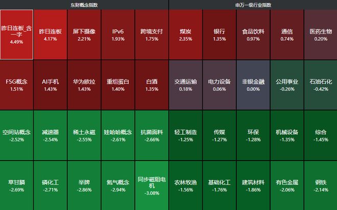 分行业来看,煤炭、银行、食品饮料、通信、医药生物等行业领涨,钢铁、有色金属、建筑材料、基础化工、农林牧渔等行业领跌。
