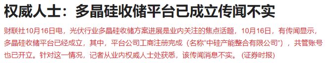 据财联社报道,有传闻显示,多晶硅收储平台已经成立,其中,平台公司工商注册完成(名称“中硅产能整合有限公司”),共管账号也已开立。针对这一情况,记者从业内权威人士处获悉,该传闻消息不实。