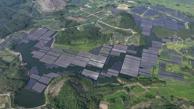 7月7日,在广西柳州市融安县潭头乡新林村黄江水库拍摄的光伏发电场。(无人机照片)中新社发 谭凯兴 摄