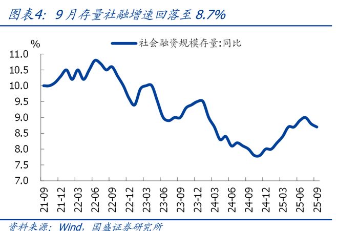 >总量看,9月新增社融3.53万亿,同比少增2297亿,好于预期(市场预期3.28万亿),但弱于季节性(近三年同期均值为3.81万亿),存量社融增速较上月回落0.1个百分点至8.7%。