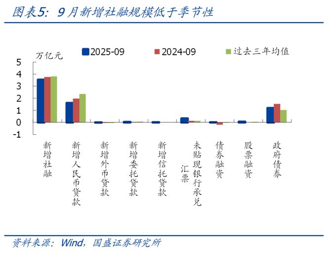 >结构看,9月社融口径人民币贷款新增1.61万亿,同比少增3662亿,是社融的主要拖累项。政府债券新增1.19万亿,同比少增3471亿,伴随政府债券逐渐发行完毕,叠加去年基数偏高,后续政府债券对社融的拖累将逐步加大。企业债券融资新增105亿,同比多增2031亿,主要也是与基数偏低有关。表外融资方面,表外三项增加3579亿,同比多增1869亿,表外票据多增是主要支撑,主要与票据冲量需求下降后、表外票据贴现至表内规模下降有关,与企业票据少增相对应。