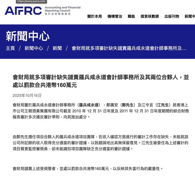 10月16日,香港会计及财务汇报局发布公告,对普华永道香港分支机构罗兵咸永道及两名合伙人予以谴责,并处以罚款合计160万港元,事由是其在王朝酒业审计工作中存在重大缺失。这已是这家全球顶级会计师事务所在一年内遭遇的又一监管处罚。