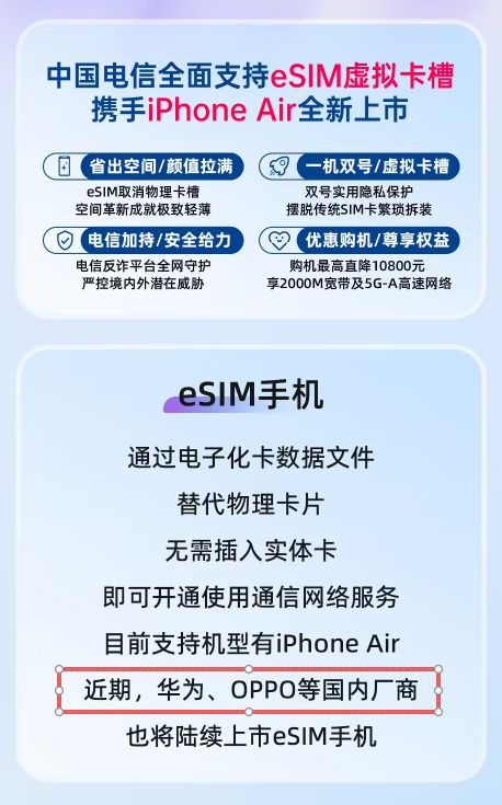 10月14日,有人发现中国电信旗下的江苏电信、陕西电信均在发文宣传自家eSIM业务时,声称华为、OPPO等国内手机厂商也将陆续上市eSIM手机。可见随着iPhone Air的正式发售,实体SIM卡槽或将迎来3.5mm耳机接口的同款结局——被众厂商纷纷删除。