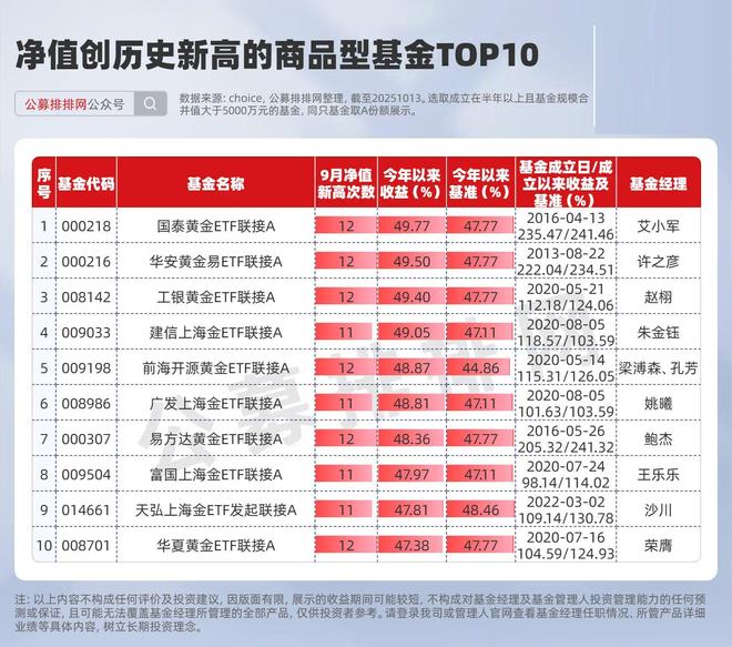 从商品型基金来看,剔除成立不足半年的基金,截至10月13日,共有46只普通股票型基金,净值仍在创历史新高的基金有15只,占比32.61%%。