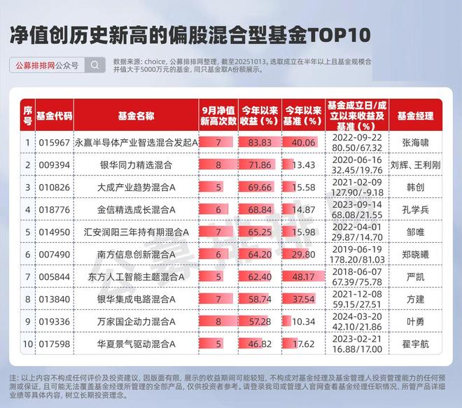 从灵活配置和平衡混合基金来看,剔除成立不足半年的基金,截至10月13日,共有1388只普通股票型基金,净值仍在创历史新高的基金仅8只,占比0.58%。