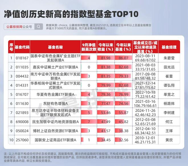 从上榜的基金来看,有色金属、稀土及资源股的行业指数基金占据大半江山,其中,国泰中证有色金属矿业主题ETF发起联接A、嘉实中证稀土产业ETF联接A和南方中证申万有色金属ETF发起联接A今年以来收益均超81%。而在主动权益类基金中表现较好的半导体主题,在指数基金中表现相对较弱。