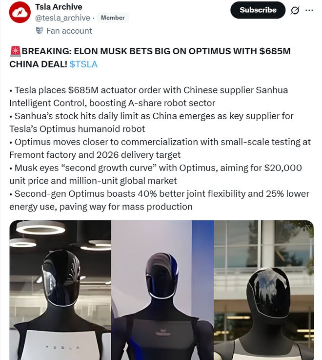 10月15日上午,ID为@tslaming的个人账号发帖称,“国内媒体报道称,特斯拉已向三花智控下达价值6.85亿美元(约合50亿元人民币)的大额订单,采购Optimus线性执行器,首批交付计划于2026年第一季度启动。”