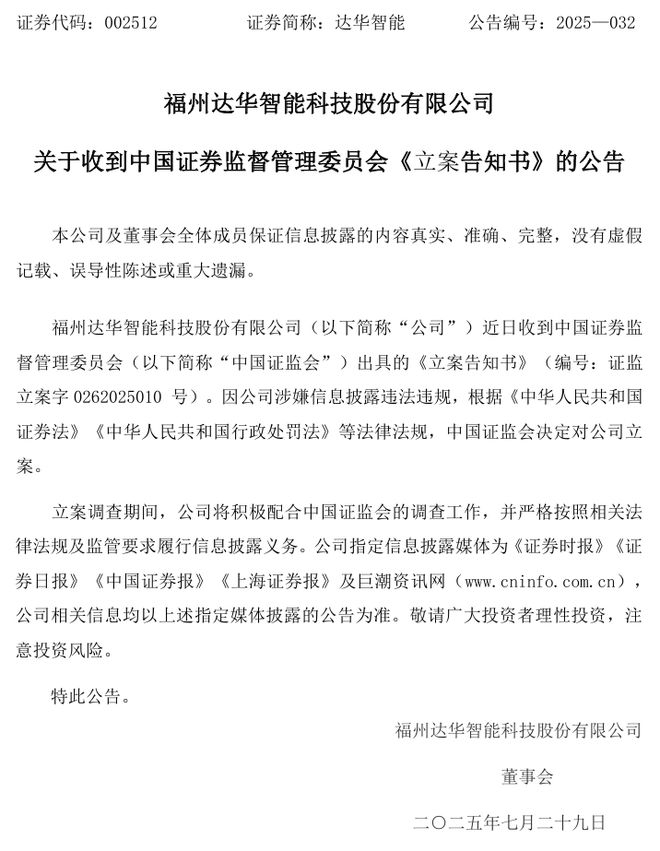 2025年10月13日,达华智能(002512.SZ)盘中创出3.57元的年内最低价。此前在2025年7月29日,公司曾发布公告,因涉嫌信息披露违法违规,中国证监会决定对公司立案。