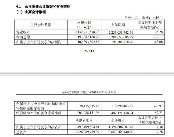 数据显示,2025年上半年,金杯汽车实现营业收入21.32亿元,同比减少5.28%;归属于上市公司股东的净利润1.03亿元,同比减少48.08%。