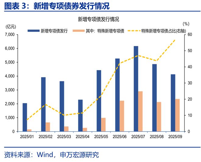 广义财政支出继续降速,或主因政府债务融资大规模支持阶段已过。截至9月28日,国债净融资+新增一般债+新增专项债累计发行10.3万亿元(含特别国债),同比多2.8万亿,发行进度87%,同比快3个百分点;累计发行新增专项债36612亿元,发行进度83%,同比落后2024年同期超6个百分点。其中,9月新增专项债中,化债比例高达57%,达年内最高。同时,截至8月中旬,除第四批消费品“以旧换新”资金外,特别国债支持的注资商业银行、“两重”项目、设备更新等也已基本下达完毕。