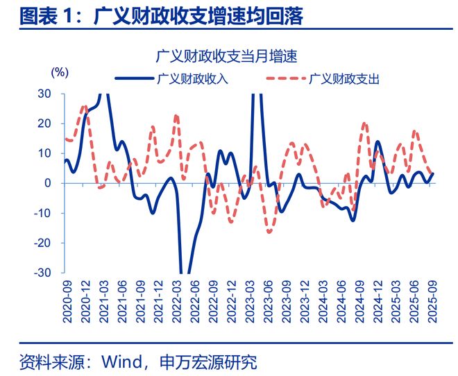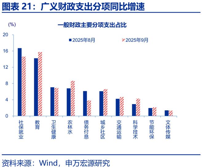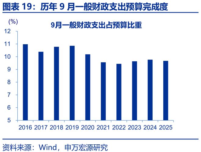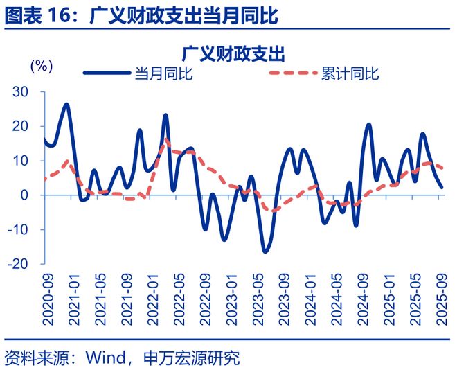 广义财政支出继续降速,或主因政府债务融资大规模支持阶段已过。截至9月28日,国债净融资+新增一般债+新增专项债累计发行10.3万亿元,发行进度87%;新增专项债累计发行进度83%,同比落后2024年同期6个百分点。同时,截至8月中旬,除第四批消费品“以旧换新”资金外,注资商业银行、“两重”项目、设备更新等也已基本下达完毕。